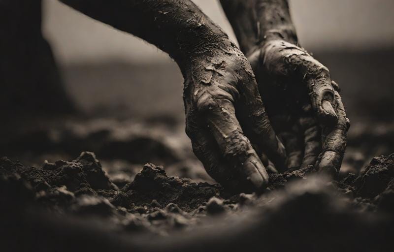Dig until dirt cakes every crease of my hardened hands.